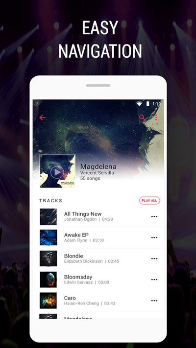 Music Player – Audio Beats یک موزیک پلیر ساده و شیک می باشد که با نصب آن روی اسمارت فون اندرویدی خود میتوانید موزیک های خود را با بهترین کیفیت پخش کنید.این پلیر از اکثریت فرمت های صوتی رایج پشتیبانی میکند و موزیک ها را با بهترین کیفیت پخش خواهد کرد.بر خلاف دیگر پلیرهای اندرویدی میتوانید تمامی موزیك ها را در یك صفحه داشته باشید و نیازی به بازگشت برای پخش موزیك بعدی ندارید.